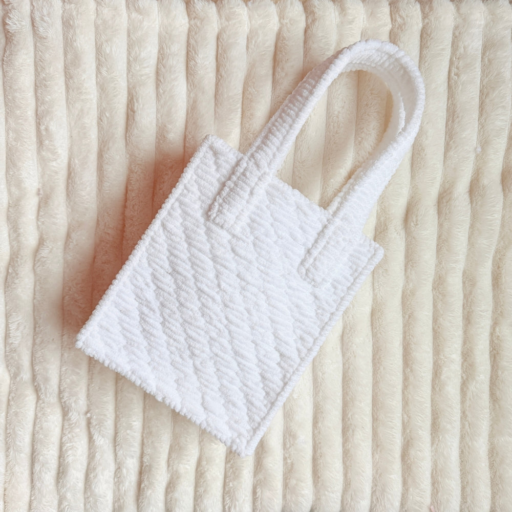 This mini tote features a dreamy white on white marble texture with a plush velvety feel that looks clean airy and timeless. The size is perfect for carrying books notebooks a tablet or your daily essentials while still feeling light comfortable and easy to bring along wherever your day unfolds.