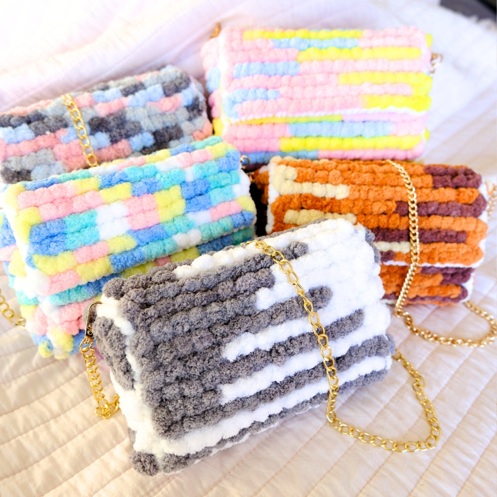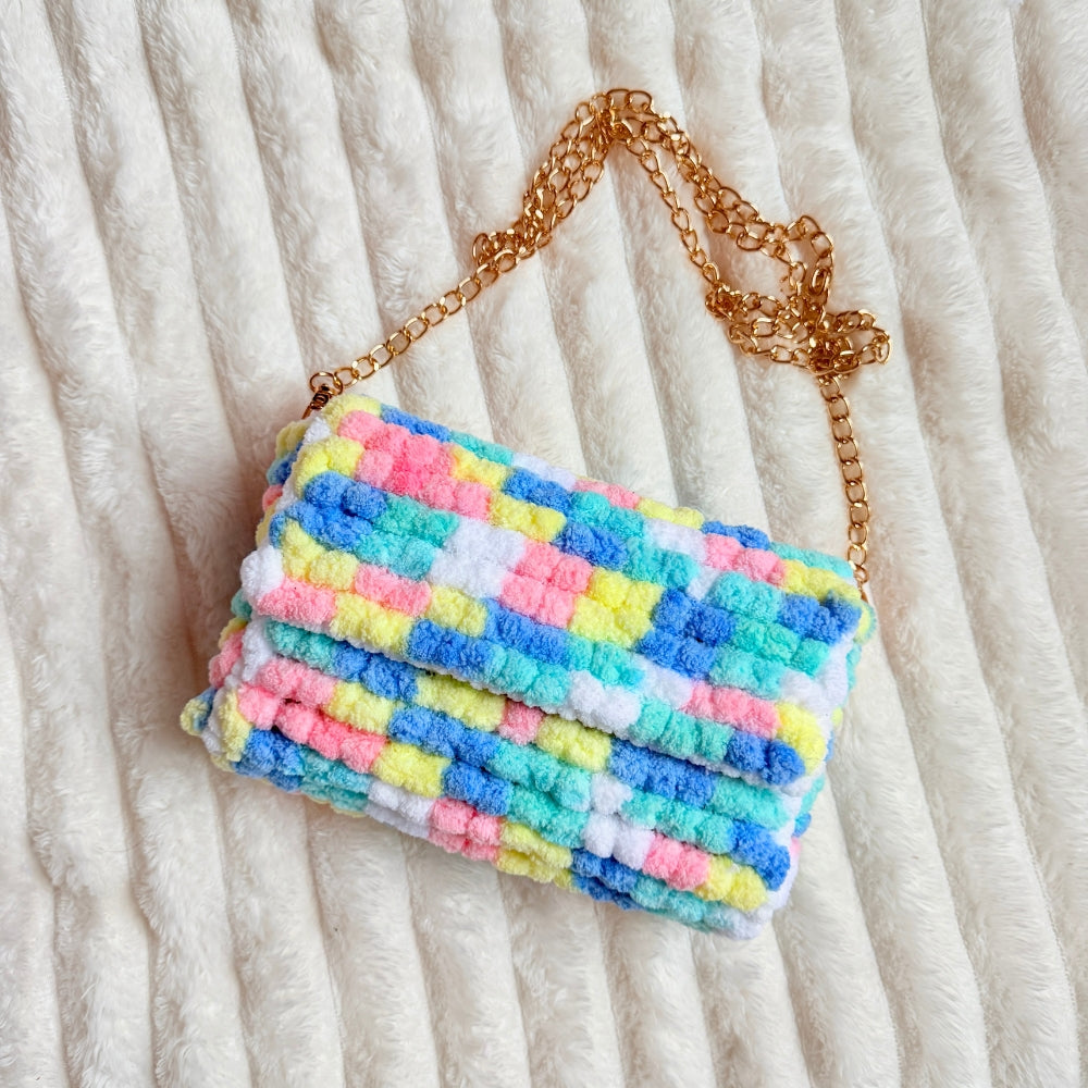 This mini bag features fluffy pastel pom pom textures in soft blue pink yellow and white layered like sweet bubblegum blocks. Finished with a delicate gold chain, it is the perfect size for your daily essentials while staying light cozy and easy to carry.