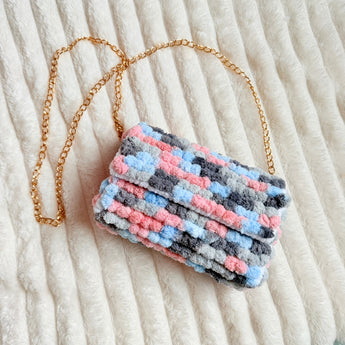 This mini bag features fluffy pom pom textures in muted gray soft blue and blush pink blended like a peaceful daydream. Finished with a delicate gold chain, it is the perfect size for your daily essentials while staying light cozy and easy to carry.