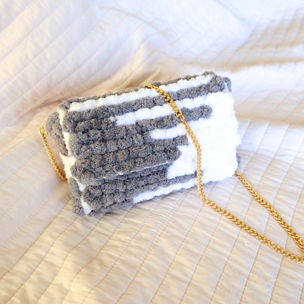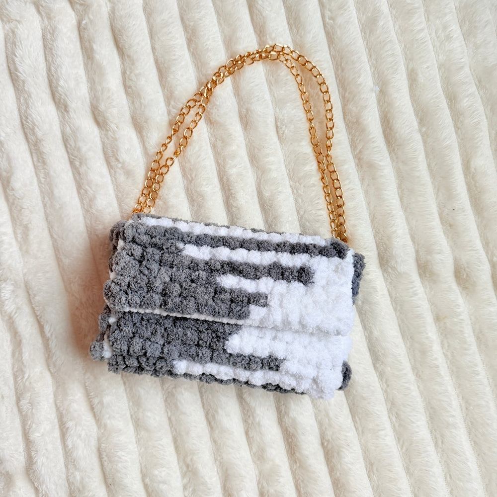 This mini bag features fluffy gray and creamy white pom pom texture layered like soft mochi blocks. Finished with a delicate gold chain, it is the perfect size for your daily essentials.