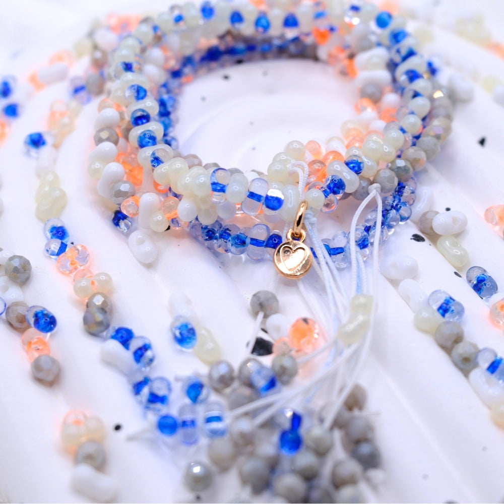 Inspired by the quiet beauty of winter mornings, the Frozen Sky bracelet captures the balance between stillness and light. The soft blues and icy grays mirror the calm of a frozen horizon, while hints of warm peach glisten like the first sunrise after snowfall.